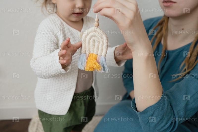 Мама и дочь смотрят на радугу. Крупный план игрушки макраме ручной работы