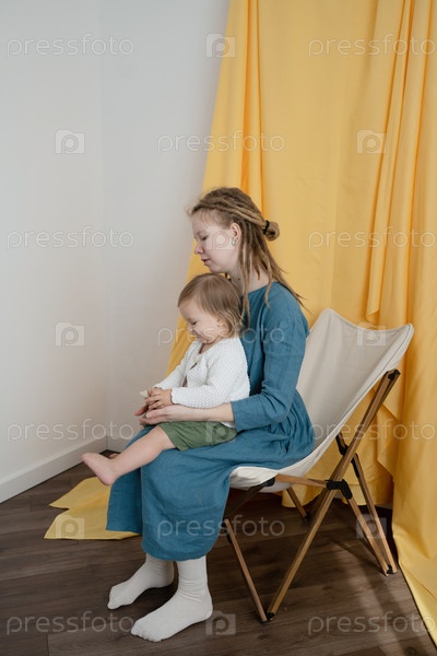 Мать и дочь сидят на шезлонге в комнате с желтыми шторами