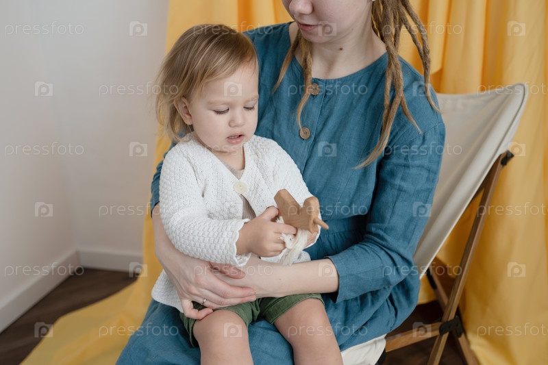 Мать и маленький ребенок играют с деревянной игрушкой. Мама и дочь сидят на стуле и проводят время вместе