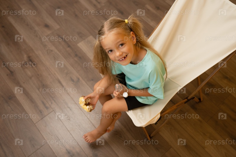 Веселая девушка ест пончики, пьет молоко, сидя на стуле