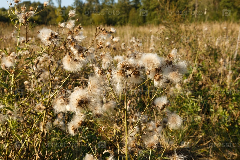 Головка семени чертополоха. Белые пушистые семена чертополоха. Дикие цветы в поле