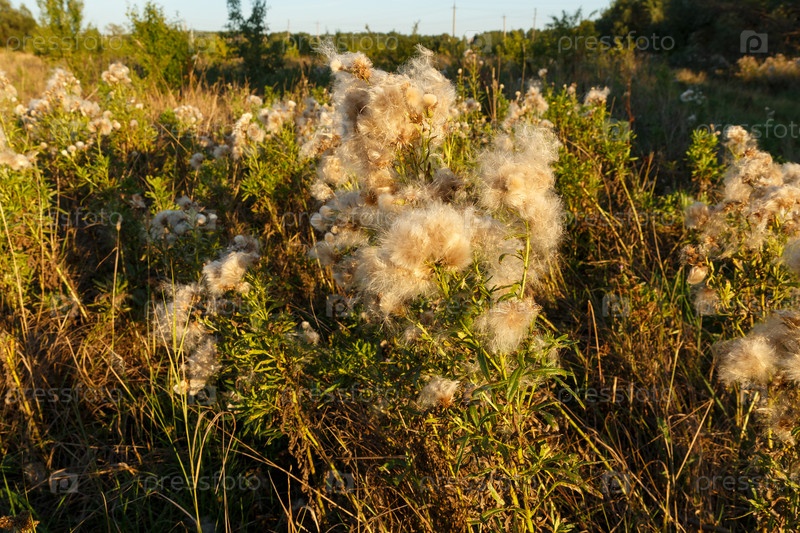 Головка семени чертополоха. Пушистые семена чертополоха. Вечерний свет