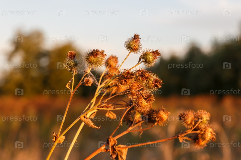 Репейник большой сушеный. Арктиум лаппа. Лопух в лучах заходящего солнца