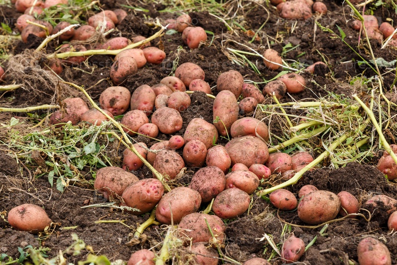 Куча спелого картофеля на земле в поле. Уборка картофеля