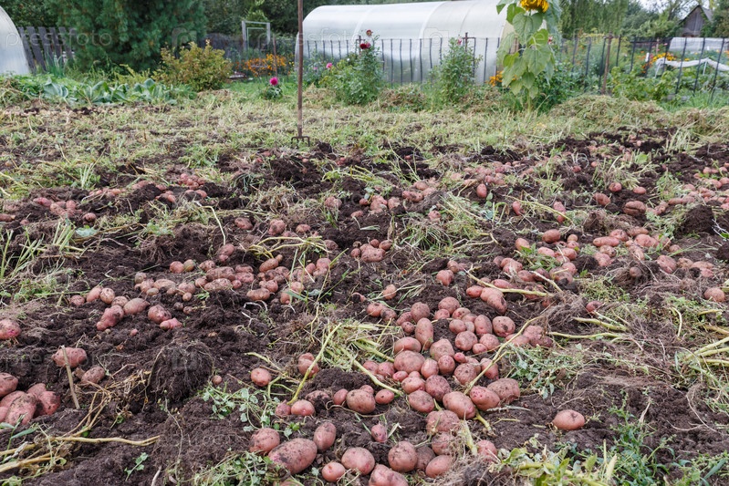 Красный картофель, выкопанный из земли в огороде. Уборка картофеля