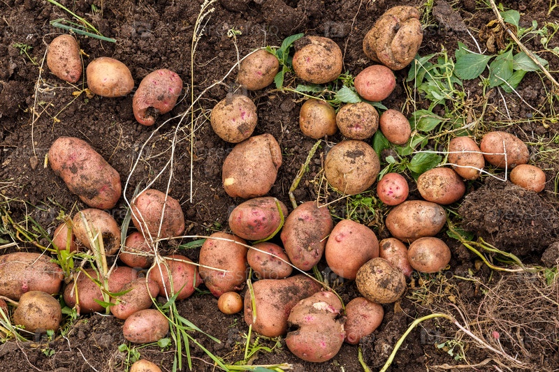 Свежий картофель в поле. Уборка картофеля