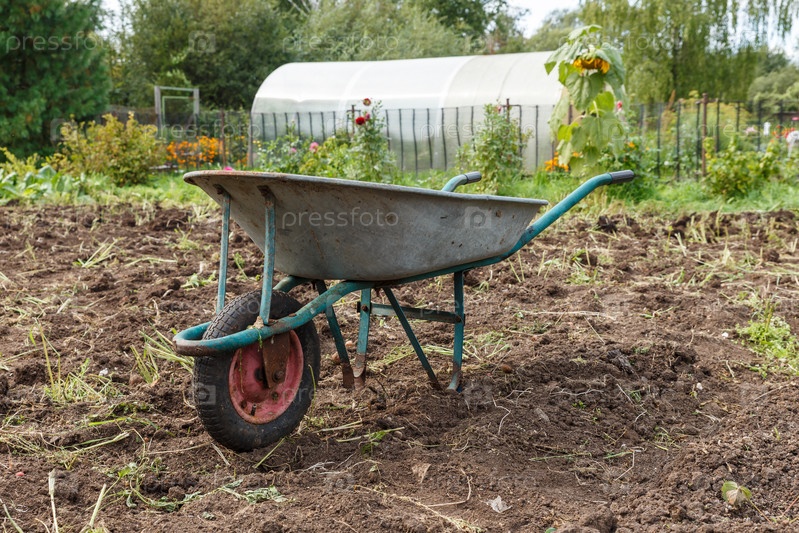 Тачка стоит в саду. Уборка картофеля