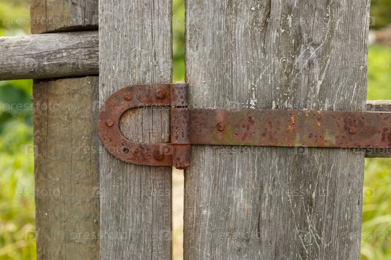Старая ржавая металлическая дверная петля. Железная дверная петля на деревянном заборе