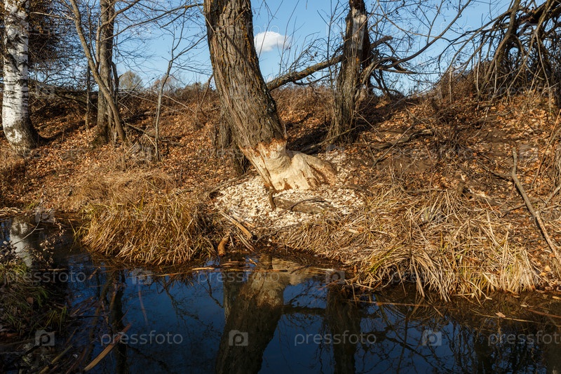 Дерево, обглоданное бобрами на берегу реки. Признаки активности бобра