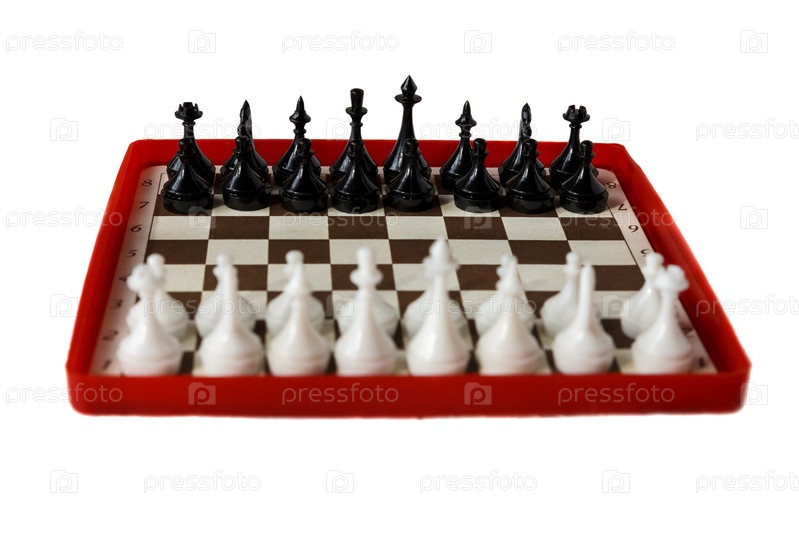 Пластиковая шахматная доска, изолированные на белом фоне. Туристические шахматы. Выборочный фокус. Сосредоточьтесь на черных фигурах