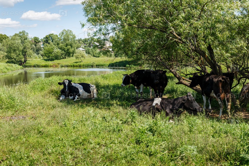 Небольшое стадо коров отдыхает в тени дерева на лугу у реки