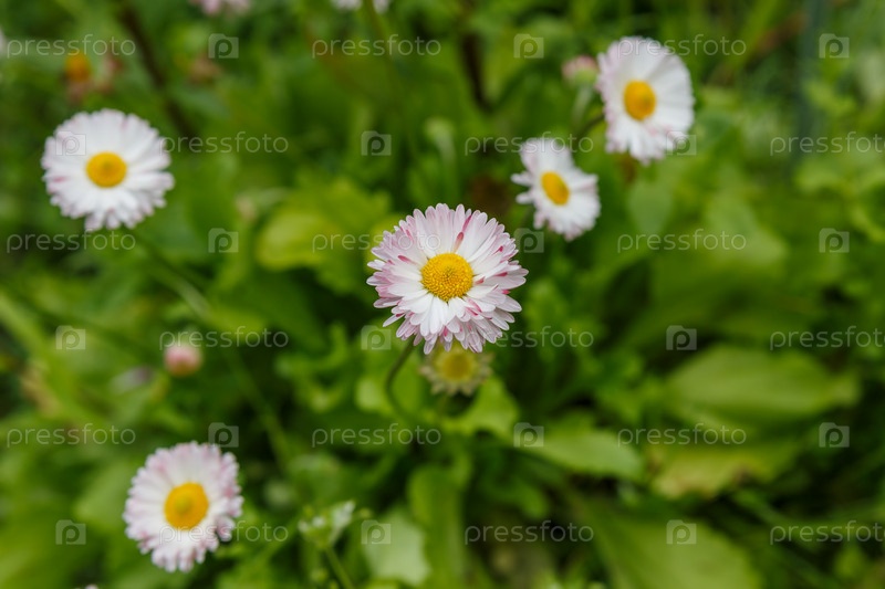 Обычная ромашка или Bellis perennis на лужайке
