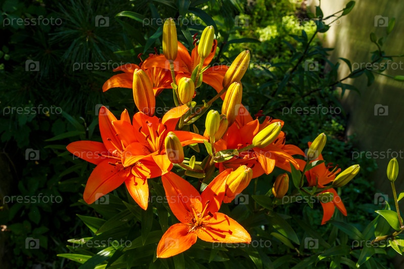 Цветок в саду. Лилия. Оранжевый цветок лилии растет рядом с теплицей