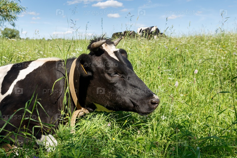 Корова лежит в траве на пастбище. Голова коровы крупным планом