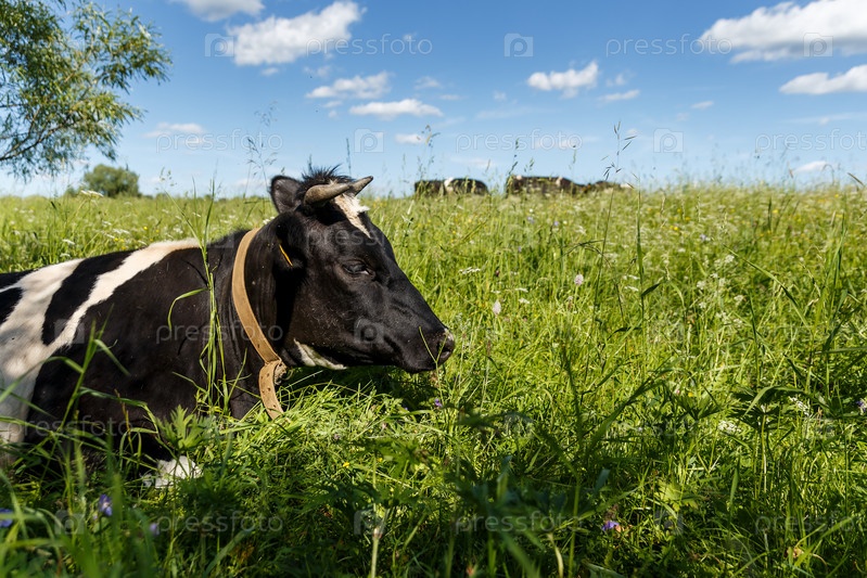 Корова лежит в зеленой траве на пастбище