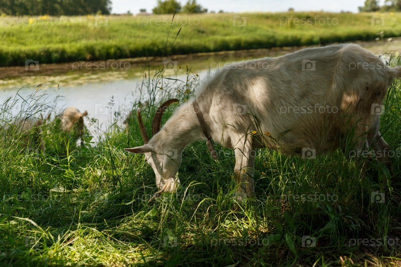 Белая коза ест траву на берегу реки. Коза на пастбище