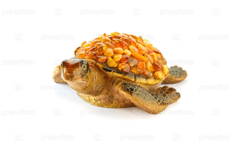 Фигурка черепахи на белом фоне с янтарными камнями на панцире. Передний план