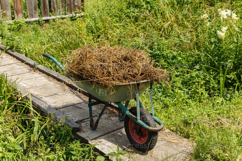 Садовая тележка с натуральным коровьим навозом. телега стоит на деревянном мосту