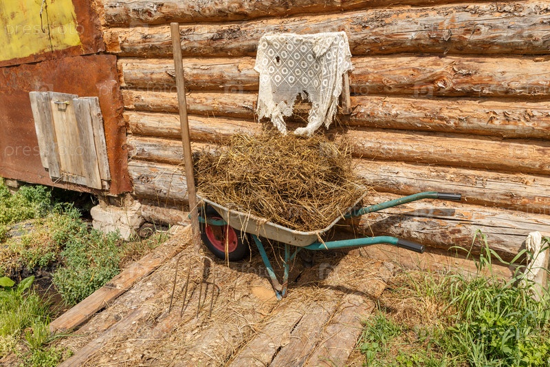 Садовая тележка, наполненная коровьим навозом, стоит у стены сарая
