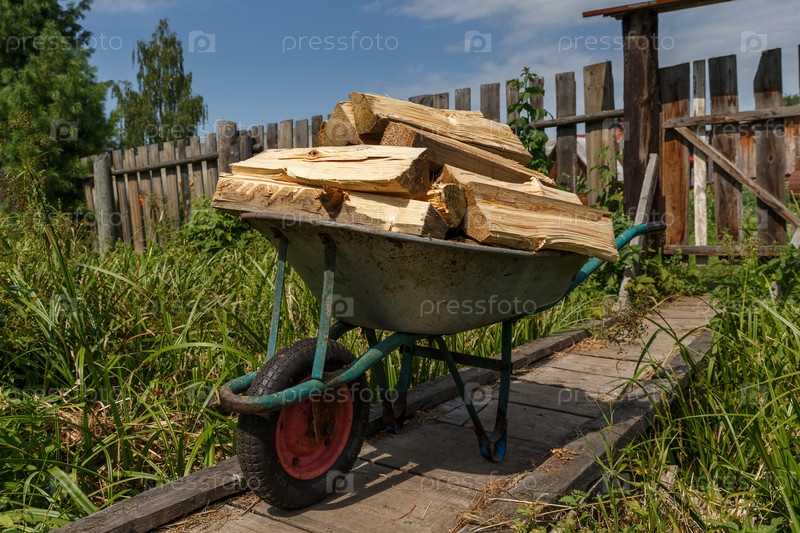 Садовая тележка с рубленой древесиной стоит на деревянном мосту