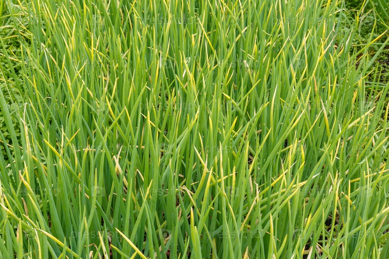 Зеленый лук на грядке. Сухие листья лука после засухи