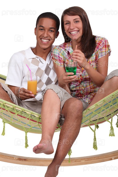 Пара наслаждается тропическим коктейлем в гамаке