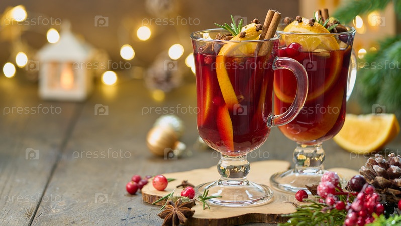 Два стакана глинтвейна. Рождественские украшения. Выборочный фокус, размытый фон, пространство для копирования