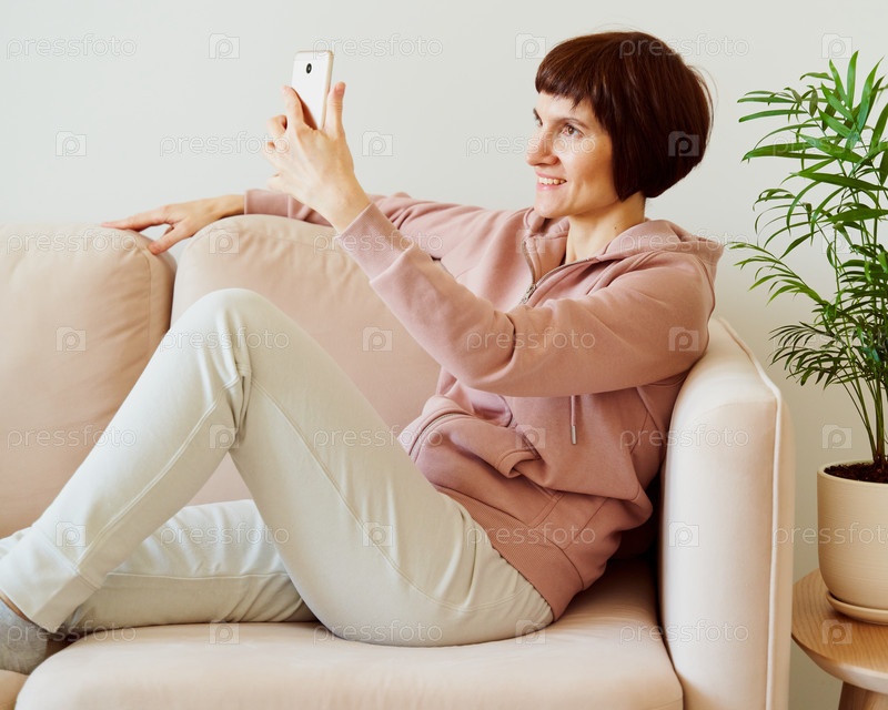 Портрет зрелой женщины, делающей селфи на мобильном телефоне. Женщина средних лет в домашней спортивной одежде пастельных тонов сидит на диване и разговаривает в видеочате с друзьями. Красивая улыбающаяся дама