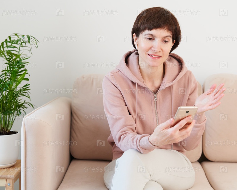 Портрет зрелой женщины, записывающей аудиосообщение, говорящей в микрофон мобильного телефона. Женщина средних лет в домашней одежде пастельных тонов разговаривает по аудиочату. Дистанционное обучение, обучение и наставничество