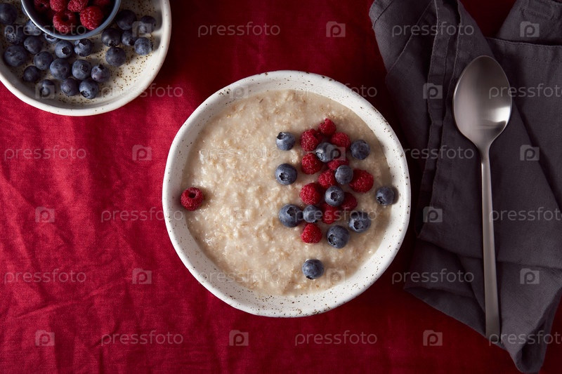 Овсяная каша с черникой на темно-красной льняной скатерти из клюквы. Вид сверху, пространство для копирования