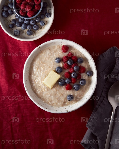 Овсяная каша с черникой, черникой. Завтрак в белой миске со свежими ягодами, вертикальный