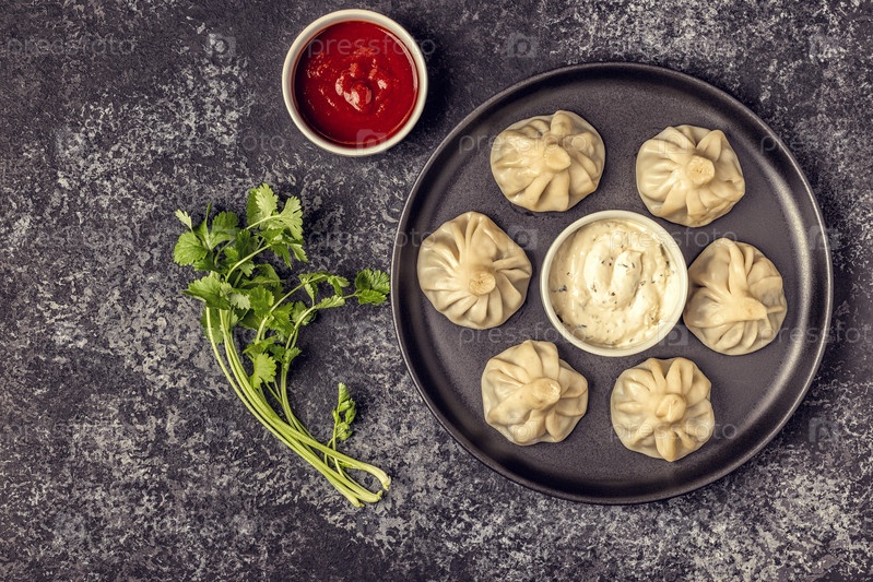 Традиционные вареники Хинкали на пару с томатным и тартарским соусом