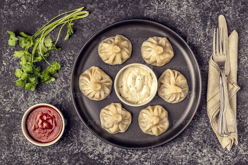 Традиционные вареники Хинкали на пару с томатным и тартарским соусом