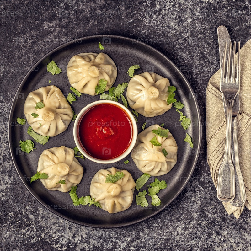 Традиционные вареники Хинкали на пару с томатным соусом