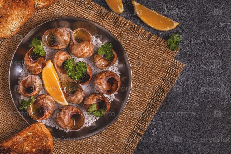 Жареные улитки с лимоном, багетом и петрушкой