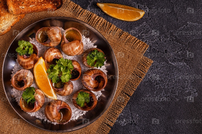 Жареные улитки с лимоном, багетом и петрушкой