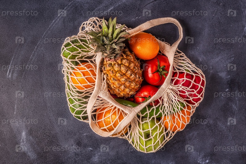 Свежие овощи и фрукты в сетке мешка