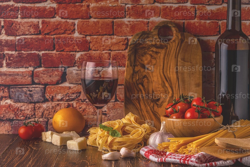 Продукты для приготовления пищи - макароны, помидоры, чеснок, оливковое масло и красное вино