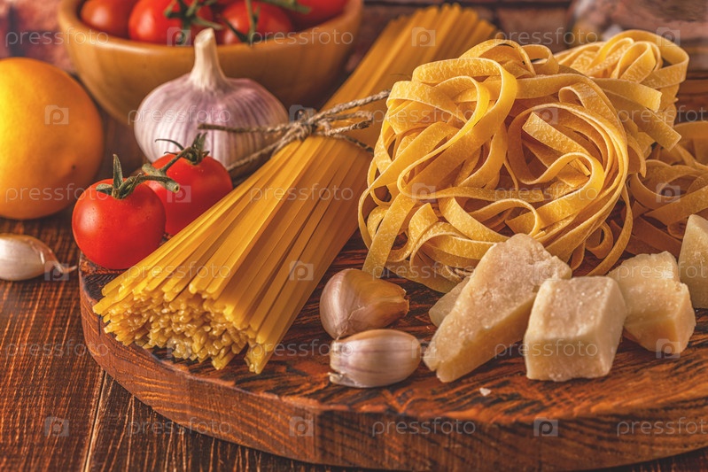 Продукты для приготовления пищи - макароны, помидоры, чеснок, оливковое масло и красное вино