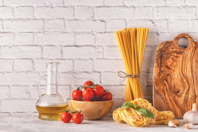 Продукты для приготовления - макароны, помидоры, чеснок, оливковое масло, базилик
