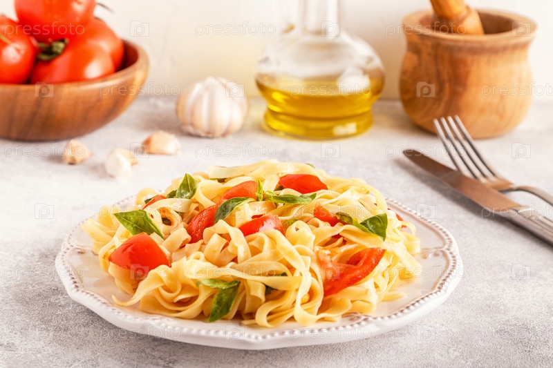 Паста с томатным соусом, подается с базиликом