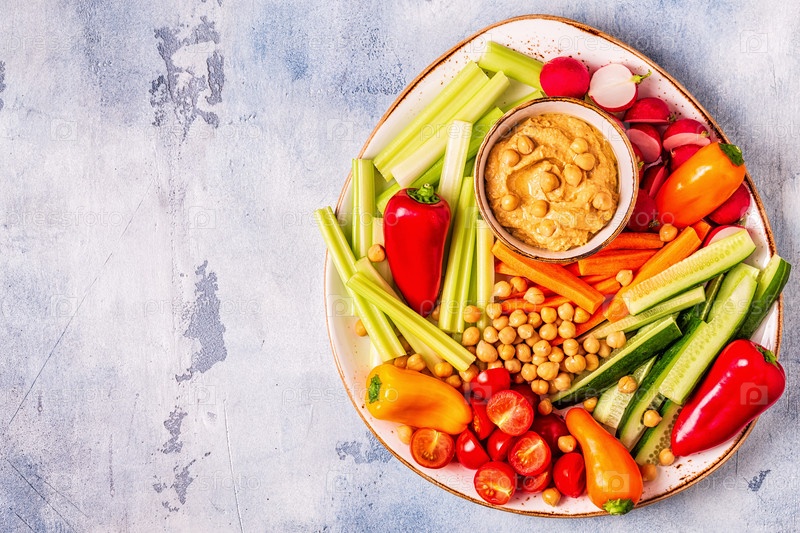 Хумус с различными свежими сырыми овощами