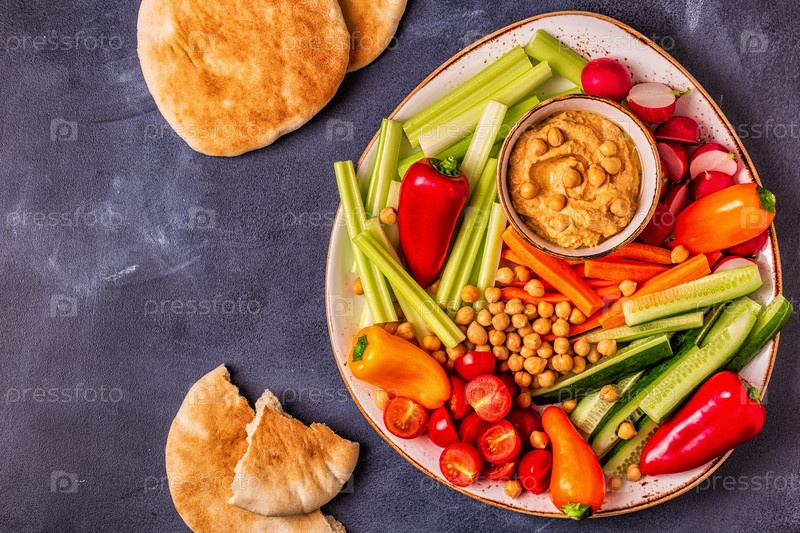 Хумус с различными свежими сырыми овощами