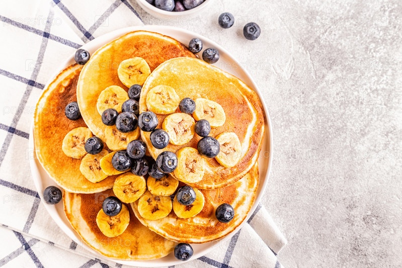 Блинчики с бананом, черникой на белой тарелке