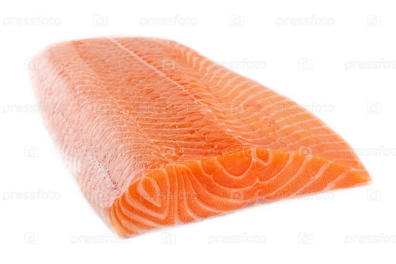 Свежее сырое филе лосося на белом фоне, вид сбоку