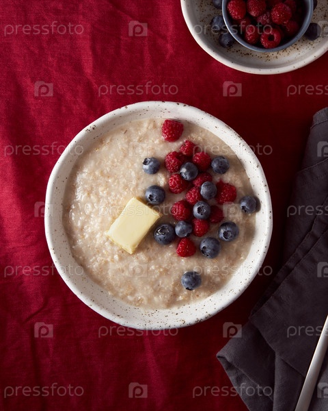 Овсяная каша с черникой, черникой. Завтрак в белой миске со свежими ягодами, вертикальный