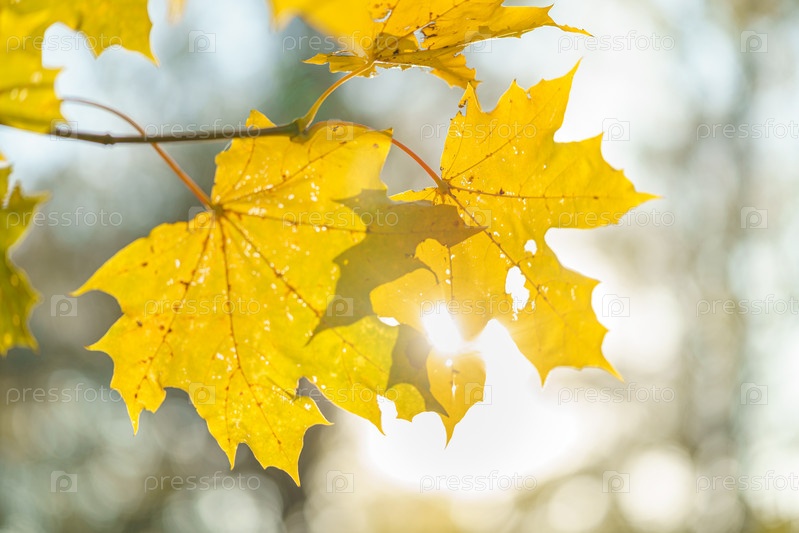Осенний фон с кленовыми листьями на дереве с солнечным лучом
