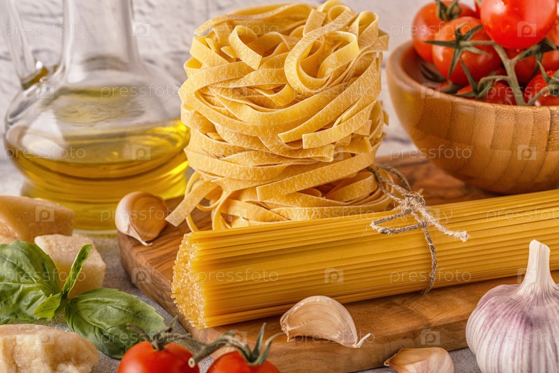 Продукты для приготовления - макароны, помидоры, чеснок, оливковое масло, базилик