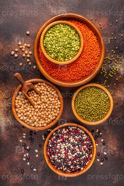 Ассортимент бобовых - чечевица, горох, мунг, нут и разные бобы