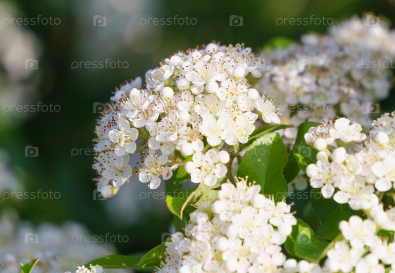 Белые цветы Spiraea nipponica на размытом зеленом фоне